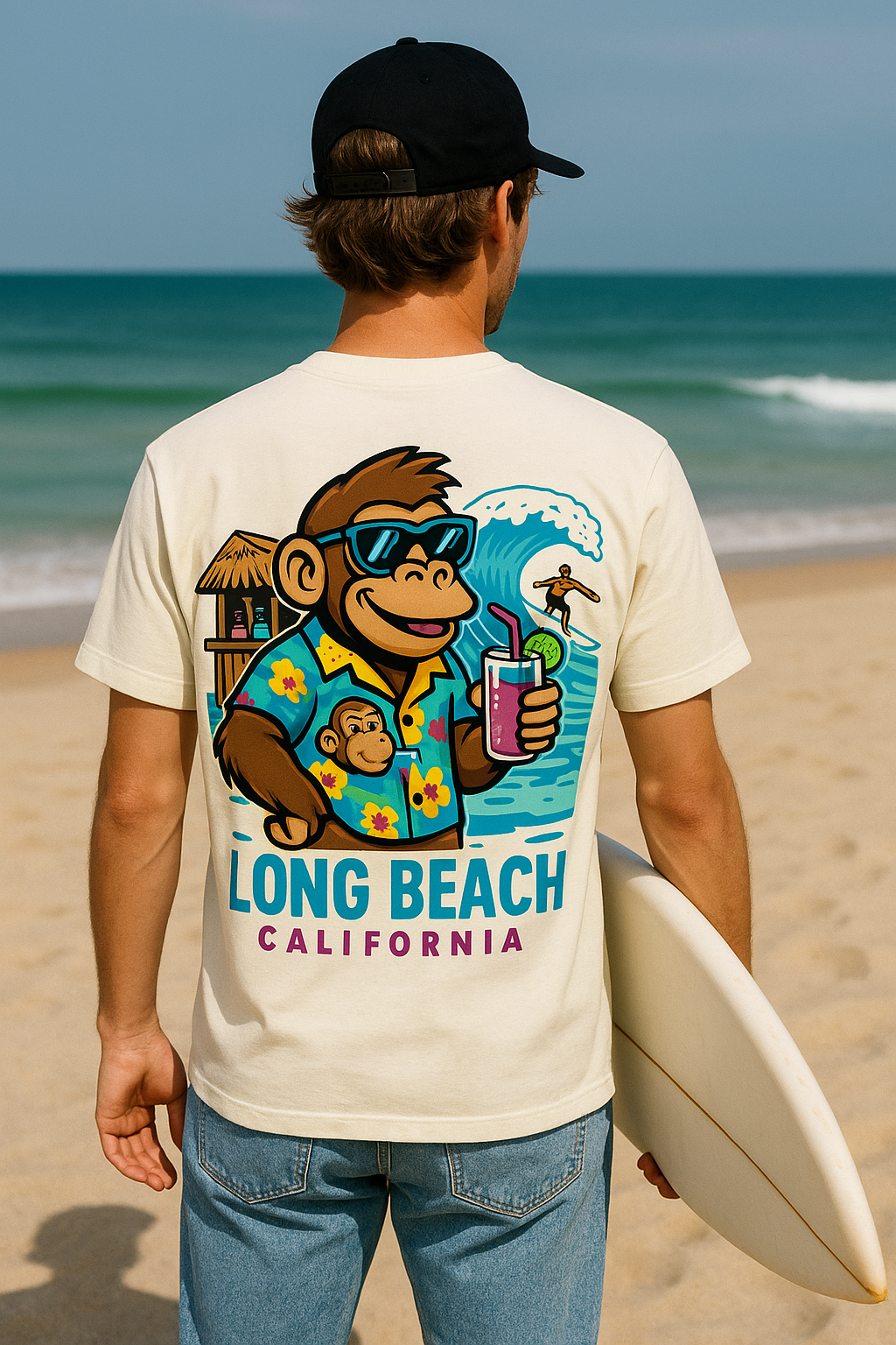 Tee- shirt "Long Beach California, ambiance tropicale et good vibes assurées avec ce visuel fun et coloré. Singe chill en chemise hawaïenne, cocktail à la main, surfeur à l'horizon : le parfait clin d'oeil à l'été californien. Coton doux, coupe classique, imprimé dos impactant.