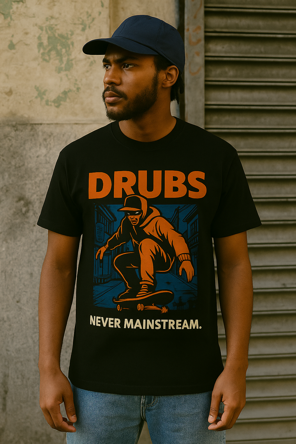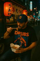 Visuel audacieux et graphique inspiré du skate et des ruelles japonaises. L'illustration dynamique du rider incarne l'attitude rebelle et underground de la street culture. Imprimé dos impactant, logo DRUBS orange intense. A porter de jour comme de nuit, entre ramen et freestyle.