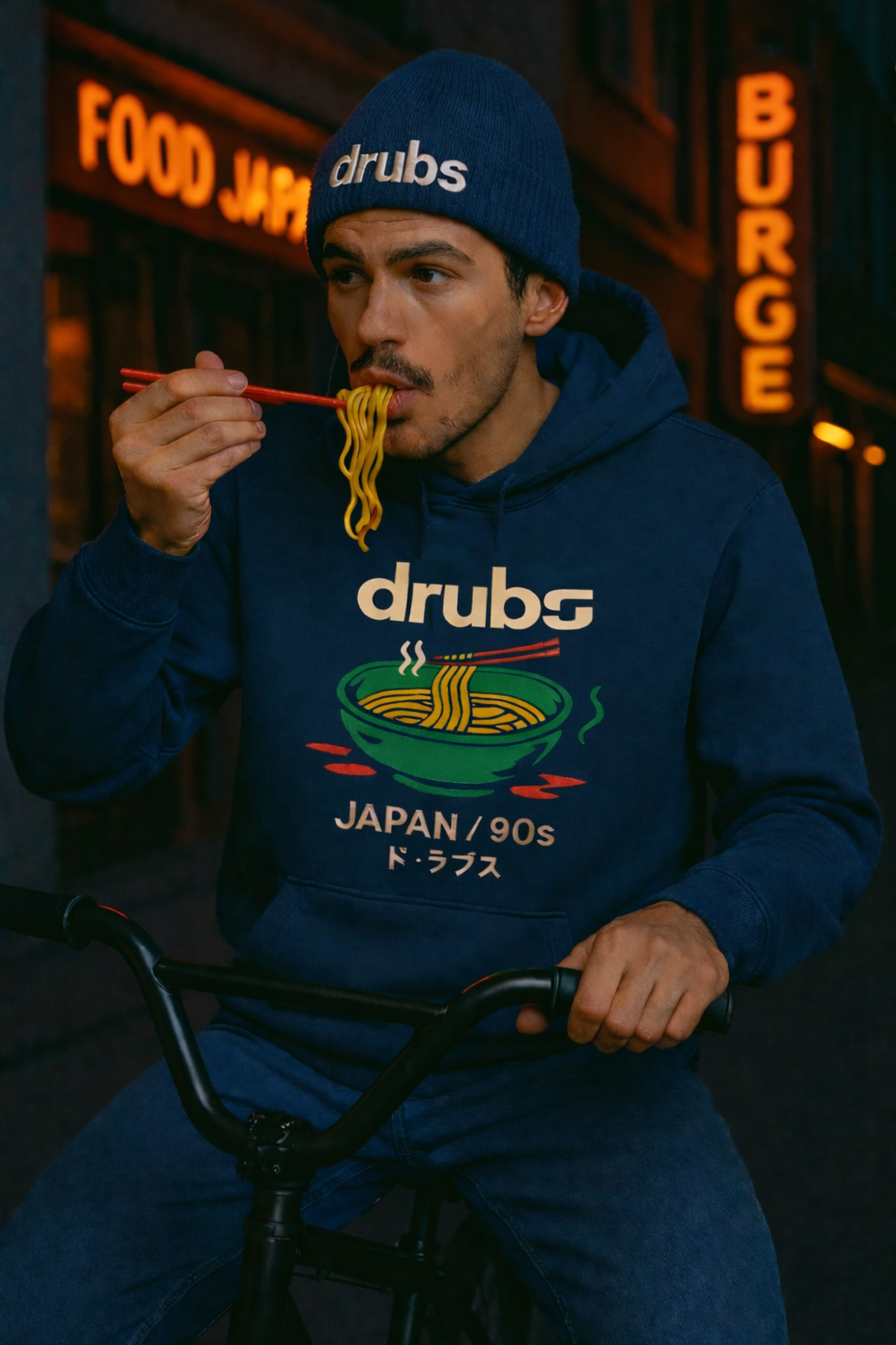 Plonge au coeur du Japon underground avec ce hoodie DRUBS, hommage vibrant aux ruelles animées des années 90. Inspiré des stands de ramen fumants, ce visuel iconique mêle graphisme rétro, culture manga et esprit skate. Confectionné dans un molleton pretium, il incarne un lifestyle: celui des riders nocturnes, des food lovers et des passionnés de culture nippone.